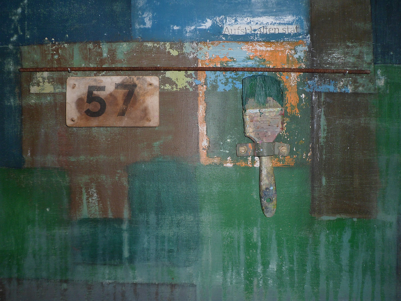 mixed media - holz, karton, papier, eisen/schrott, tusche (werkmaterial pinsel/rolle)